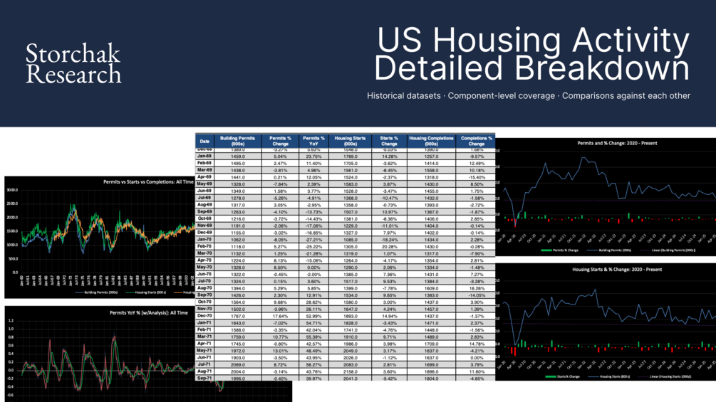 Historical US housing activity data covering building permits, housing starts, and housing completions. Data is presented in structured tables with corresponding charts, allowing direct comparison across housing activity components over time.