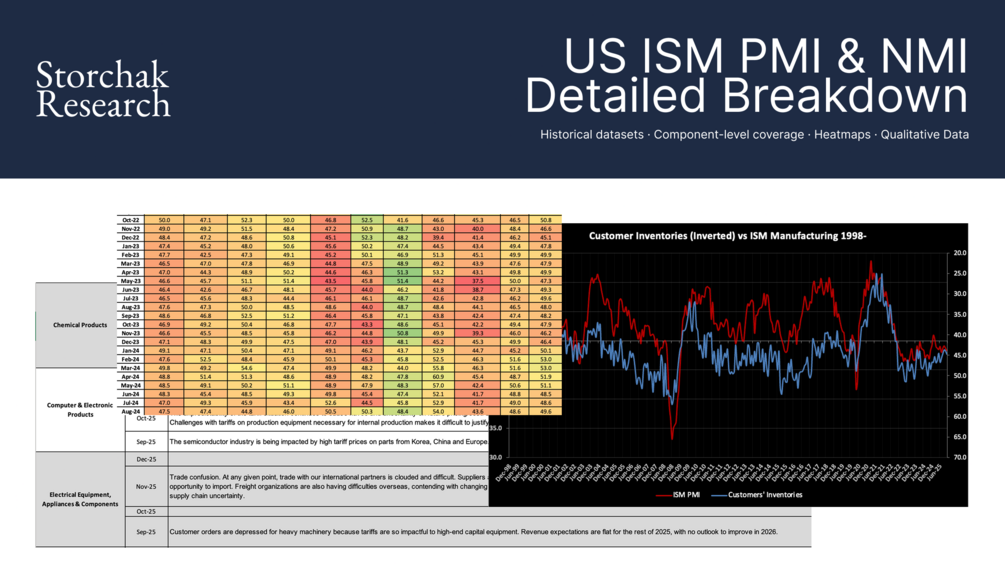 Historical ISM Manufacturing (PMI) and Non-Manufacturing (NMI) datasets with full component-level coverage. Includes headline indices, individual sub-indices, sector-level breakdowns, heatmaps, and compiled qualitative survey comments, organized in a structured spreadsheet format.